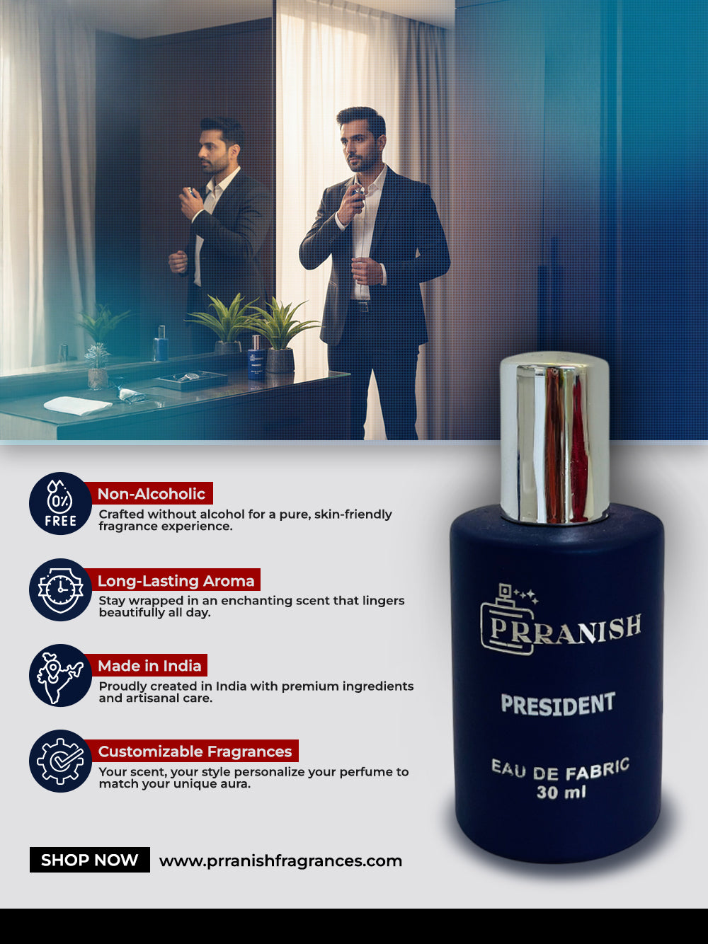PRESIDENT is a commanding Oriental Woody fragrance designed for men and women who walk with purpose and lead with confidence. It opens vibrant and spicy, transitions into a bold aromatic heart, and finishes with a warm, leathery, woody base that leaves a powerful impression. Elegant, intense, and unmistakably authoritative.